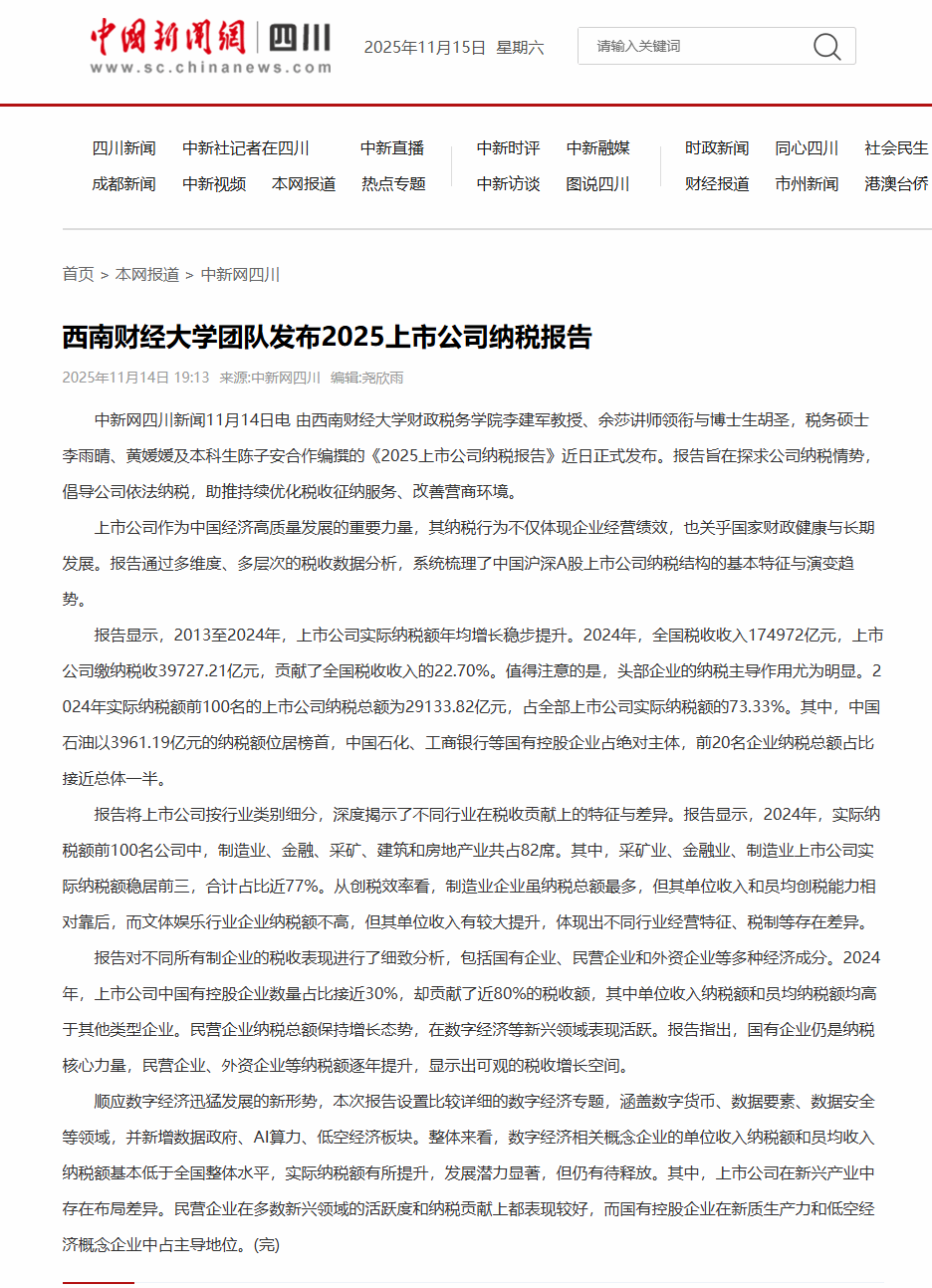 中新网四川新闻11月14日电 由西南财经大学财政税务学院李建军教授、余莎讲师领衔与博士生胡圣,税务硕士李雨晴、黄媛媛及本科生陈子安合作编撰的《2025上市公司纳税报告》近日正式发布。报告旨在探求公司纳税情势,倡导公司依法纳税,助推持续优化税收征纳服务、改善营商环境。