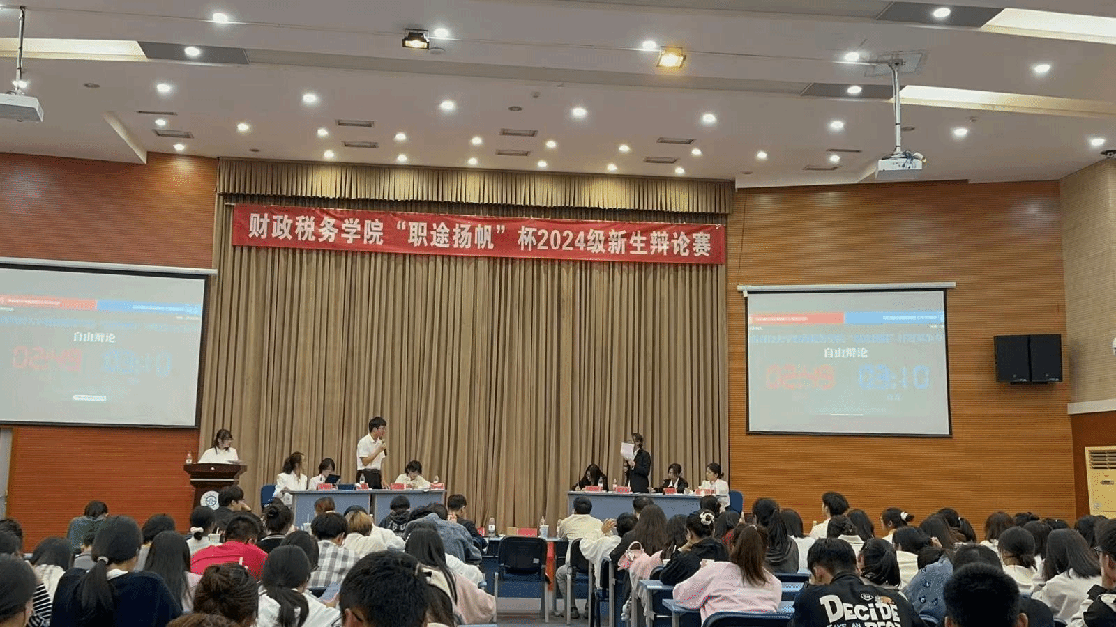 10月18日决赛在学生活动中心多功能厅展开。前三场比赛,我们已就择业与就业、兼职与留学等同财税学子息息相关的三个方面,辩出了真知灼见。本场决赛,二、三班辩手就“岗位廉洁风险防范主要靠自律还是他律”展开辩论,辩出了自己内心的声音。