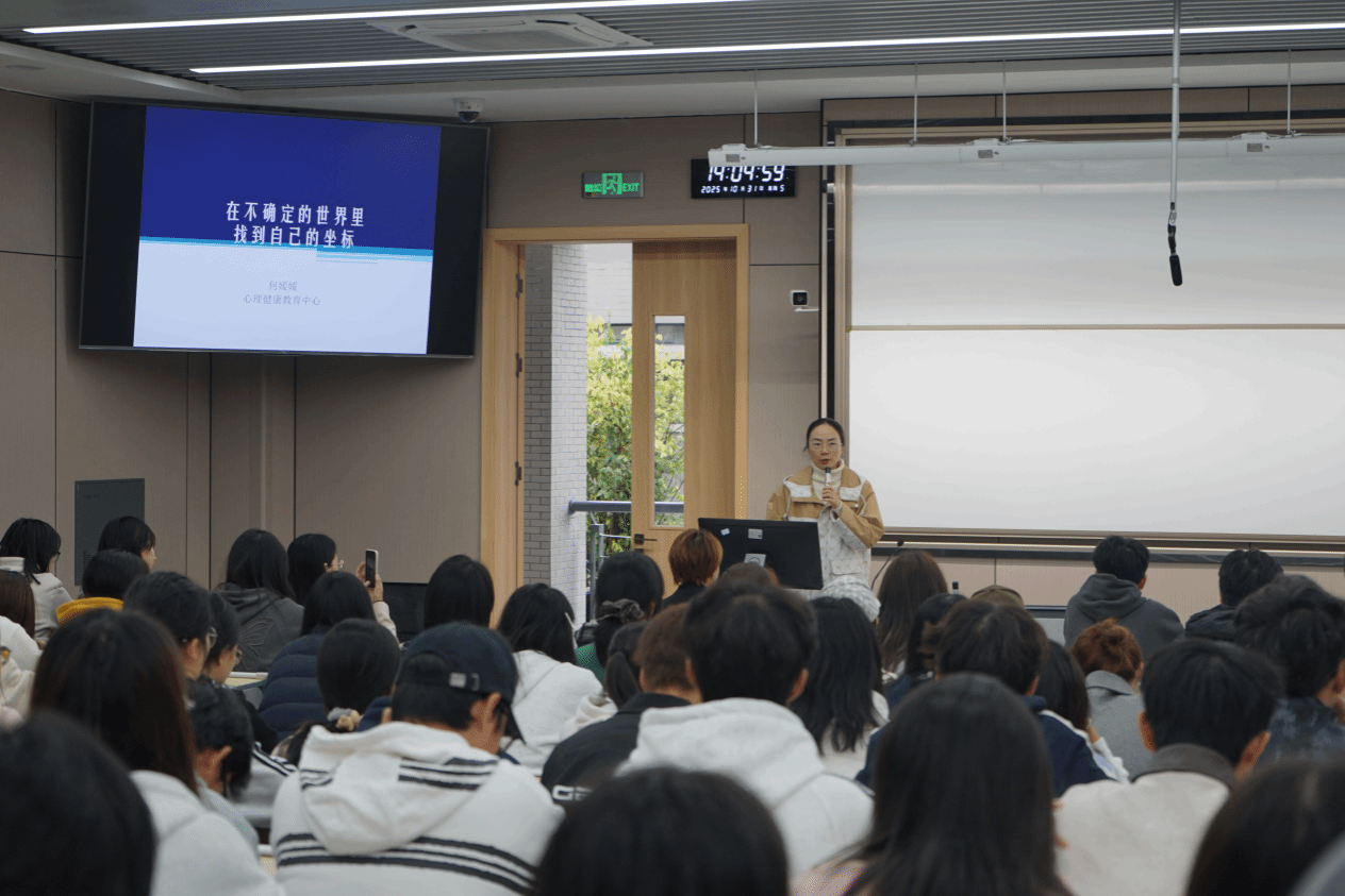2025年10月31日下午,财政税务学院学生心理工作站主办的校园心理文化月专题讲座在经世楼E103教室顺利举办。讲座主题为“从‘心’出发:在不确定的世界里,找到自己的坐标”,校心理健康教育中心何媛媛老师应邀主讲,160余新生参与。