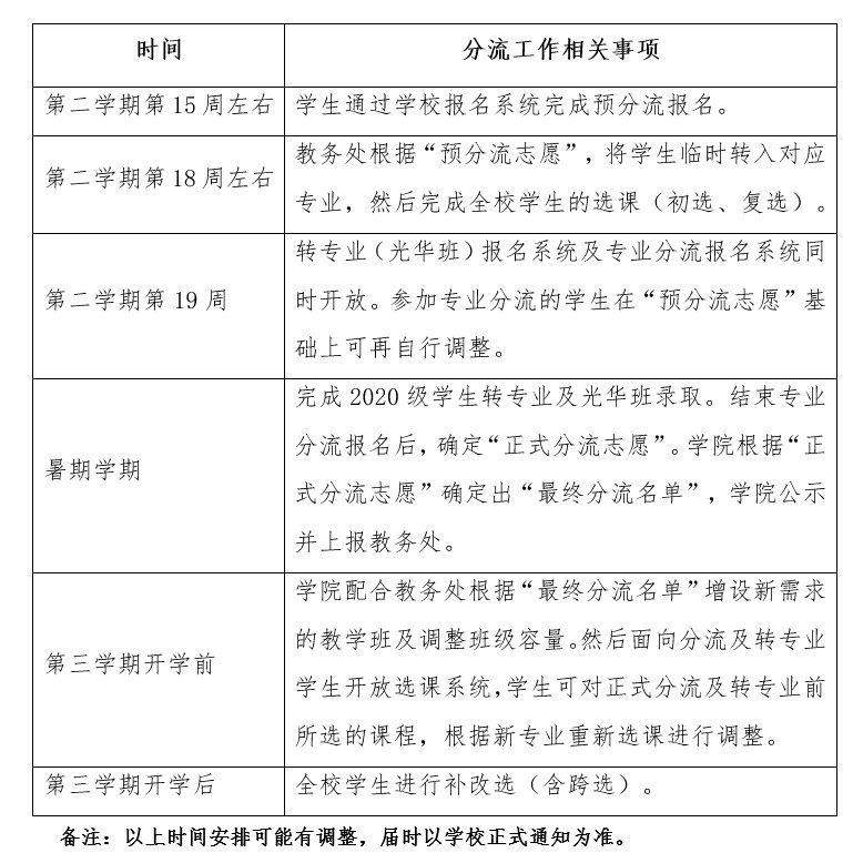专业分流工作分为预分流和正式分流两个阶段。因涉及排课和选课事宜,预分流在第一学年第二学期第15周左右进行;正式分流在第一学年暑期学期进行。