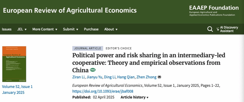 我院李子燃副教授的合著论文“Political power and risk sharing in an intermediary-led cooperative: Theory and empirical observations from China”在《European Review of Agricultural Economics》线上刊出。European Review of Agricultural Economics是欧洲农业经济学会会刊,主要刊发农业经济理论方法与政策研究领域的创新成果。