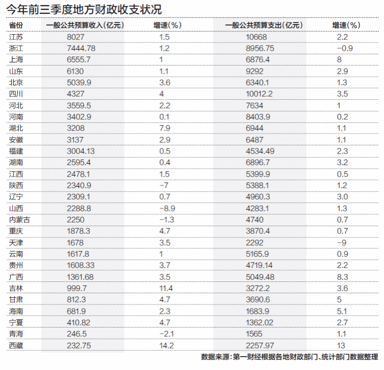 地方政府近期相继公开前三季度财政账本,总体来看地方财政收入保持小幅增长,较为平稳,而财政支出总体也保持小幅增长,支出普遍高出收入,以稳经济、保民生。