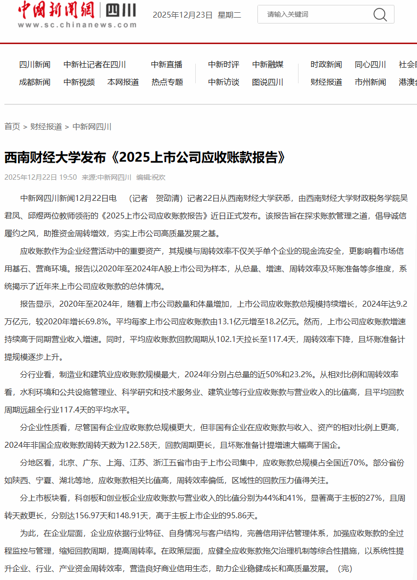 由西南财经大学财政税务学院吴君凤、邱煜两位教师领衔,资产评估硕士生郑晓莹、王一晗、战玉佳、薛雯丽合作编撰的《2025上市公司应收账款报告》发布。该报告旨在探求账款管理之道,倡导诚信履约之风,助推资金周转增效,夯实上市公司高质量发展之基。