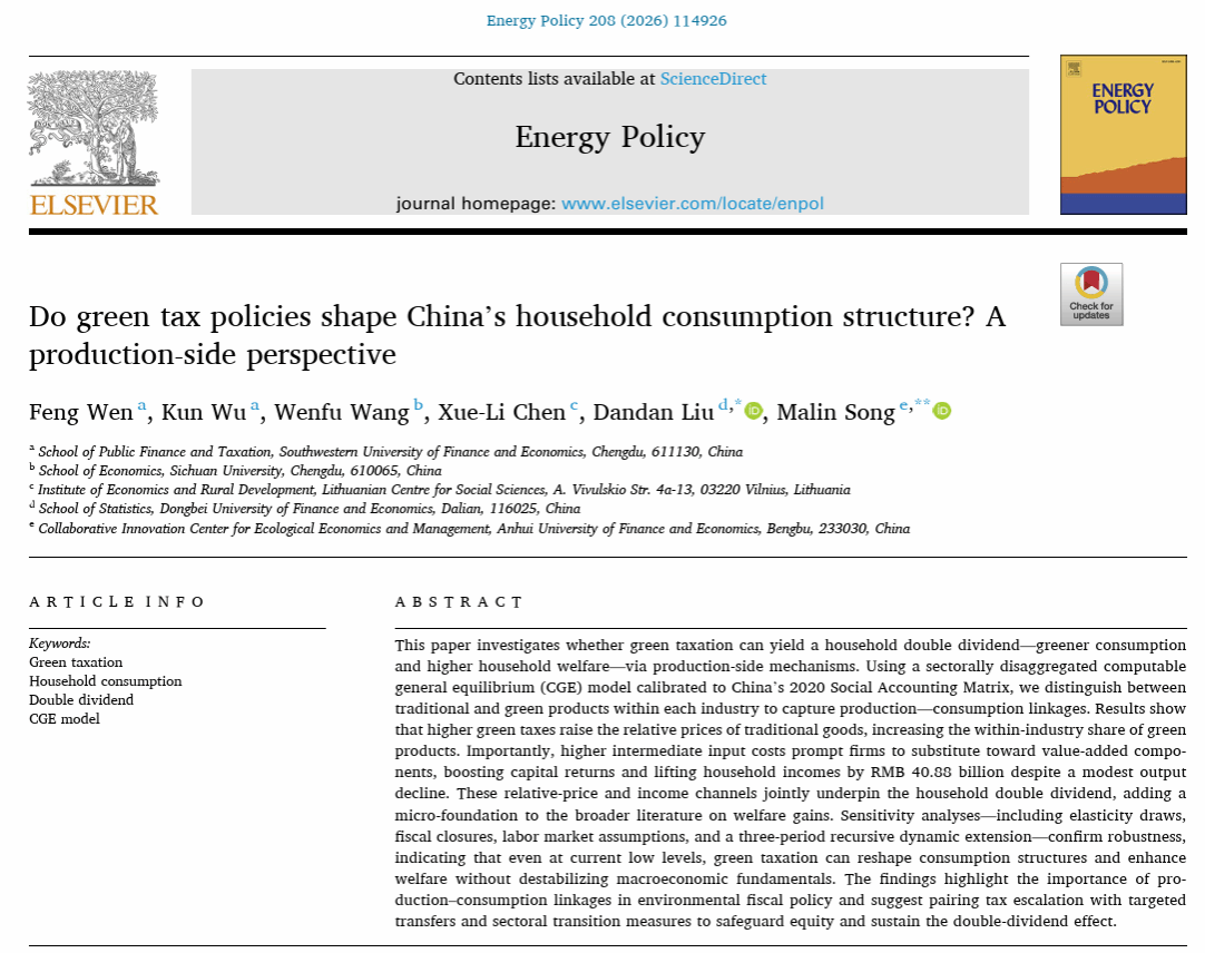 资料来源:Wen, F., Wu, K., Wang, W., Chen, X. L., Liu, D., & Song, M. (2026). Do green tax policies shape China's household consumption structure? A production-side perspective. Energy Policy, 208, 114926.