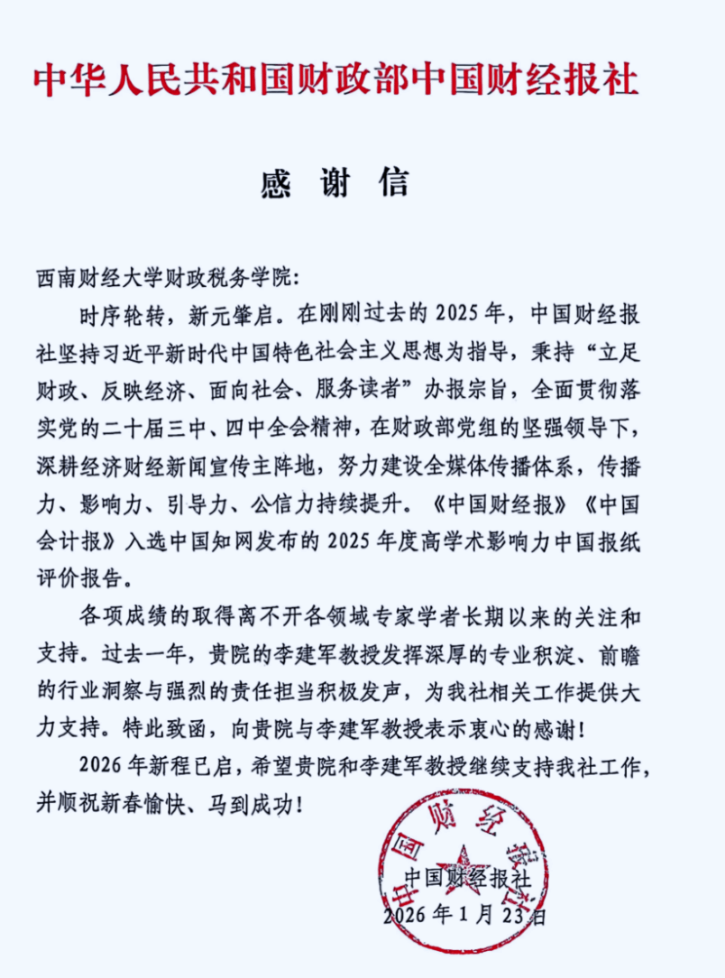 近日,财政部中国财经报社向财政税务学院发来感谢信,对我院在过去一年中给予的大力支持表示衷心感谢,并致以新春问候。