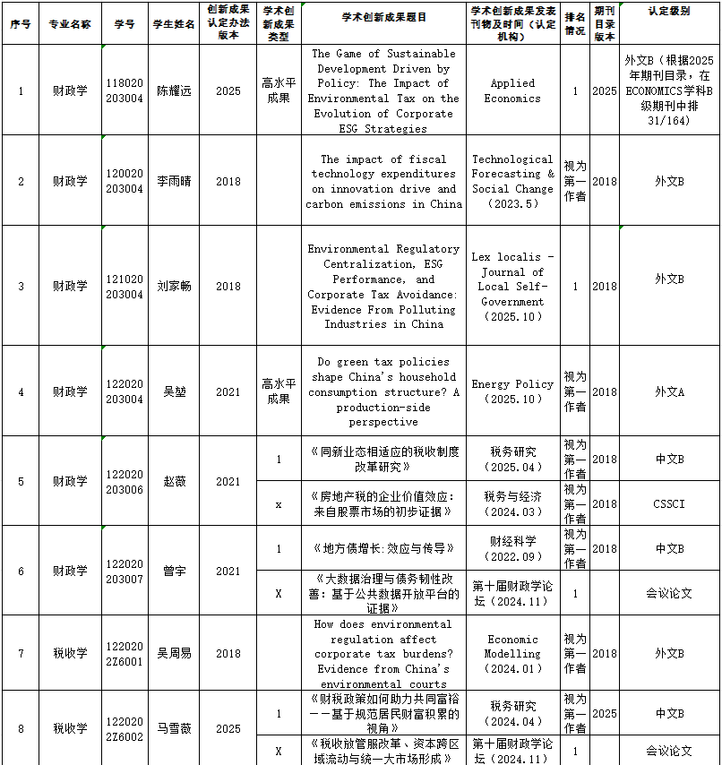 根据财政税务学院学位评定分委员会表决结果,认定陈耀远、李雨晴、刘家畅、吴堃、吴周易、赵薇、曾宇、马雪薇等8名博士研究生所提交用于申请博士学位的科研成果达到申请学位学术创新成果要求(成果原文详见附件)。现予以公示,公示期为15日,如有异议,请在公示期内提出。