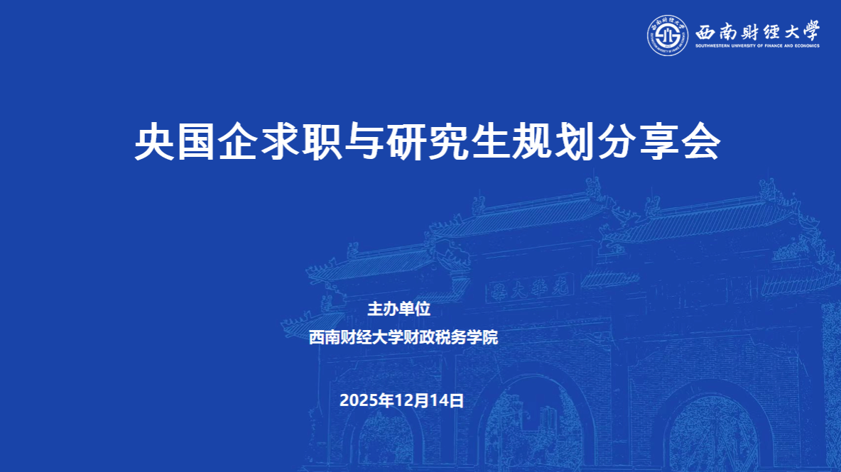 2025年12月14日,财税学院研究生会主办的“央国企求职与研究生规划分享会”在线上顺利举行。活动特邀我校2017级财政学本科、2021级税务专硕优秀毕业生,现就职于中国建筑兴业有限公司的王杰担任分享嘉宾。