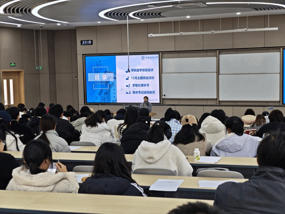 学院国际事务交流中心主任宋洋副教授介绍了“3+1”本硕连读·埃克塞特大学导学班项目,详细说明申请条件、培养模式及发展前景,为同学们提供国际化升学的新思路。2021级财政学本科、2025级税务专硕王敏纳结合自身经历,分享了学科竞赛准备、科研参与及学业规划的具体做法。助理辅导员尹倩、张卓妍分别分享期末备考策略与宪法知识。尹倩从复习计划、知识梳理等方面提供实用建议;张卓妍结合国家宪法日,讲解宪法核心内容,引导同学们增强法治意识,践行守法准则。