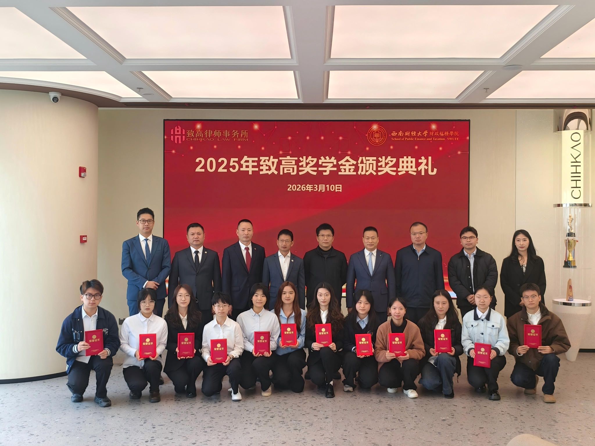 2026年3月10日上午,四川致高律师事务所携手财政税务学院联合举办企业开放日暨2025年“致高奖学金”颁奖典礼,财税学院党委副书记王隆庆、张腾飞副教授、辅导员刘余及获奖学生代表、观礼学生二十余人参加。