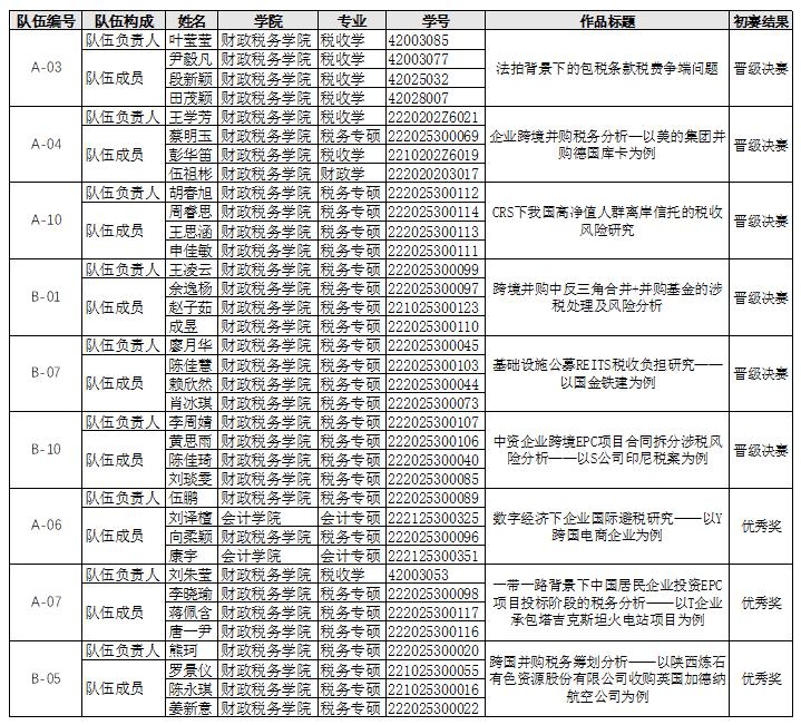 各位同学: 学院对参赛案例进行了匿名分组处理和专家评审,现公布初赛结果(排名不分先后): 决赛将于2023年4月1日(星期六)举行,请进入决赛的同学们认真准备答辩。 西南财经大学财政税务学院 2023年3月18日