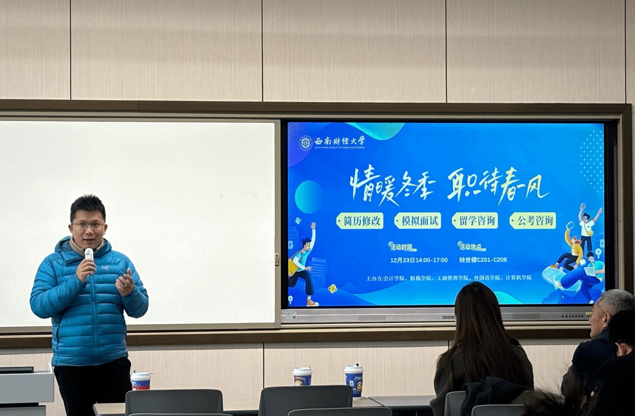 为助力学子明晰职业方向、提升求职竞争力,12月23日下午,财政税务学院牵头,联合会计学院、工商管理学院、外国语学院、计算机与人工智能学院共同打造的“情暖冬季,职待春风——大型求职OPEN DAY系列活动”在经世楼教室圆满举行。活动涵盖辅导讲座、专业咨询、实操模拟等多个板块,为不同需求的学子提供了全方位、精准化的就业支持。