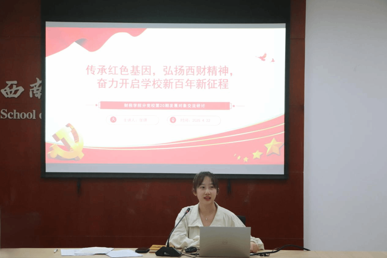 2025年4月22日下午,财税学院第20期发展对象交流研讨会在格致楼811会议室举行,本次研讨会由学院专职组织员张琪主持,主题为“传承红色基因,弘扬西财精神,奋力开启学校新百年新征程”,培训班全体学员参加。