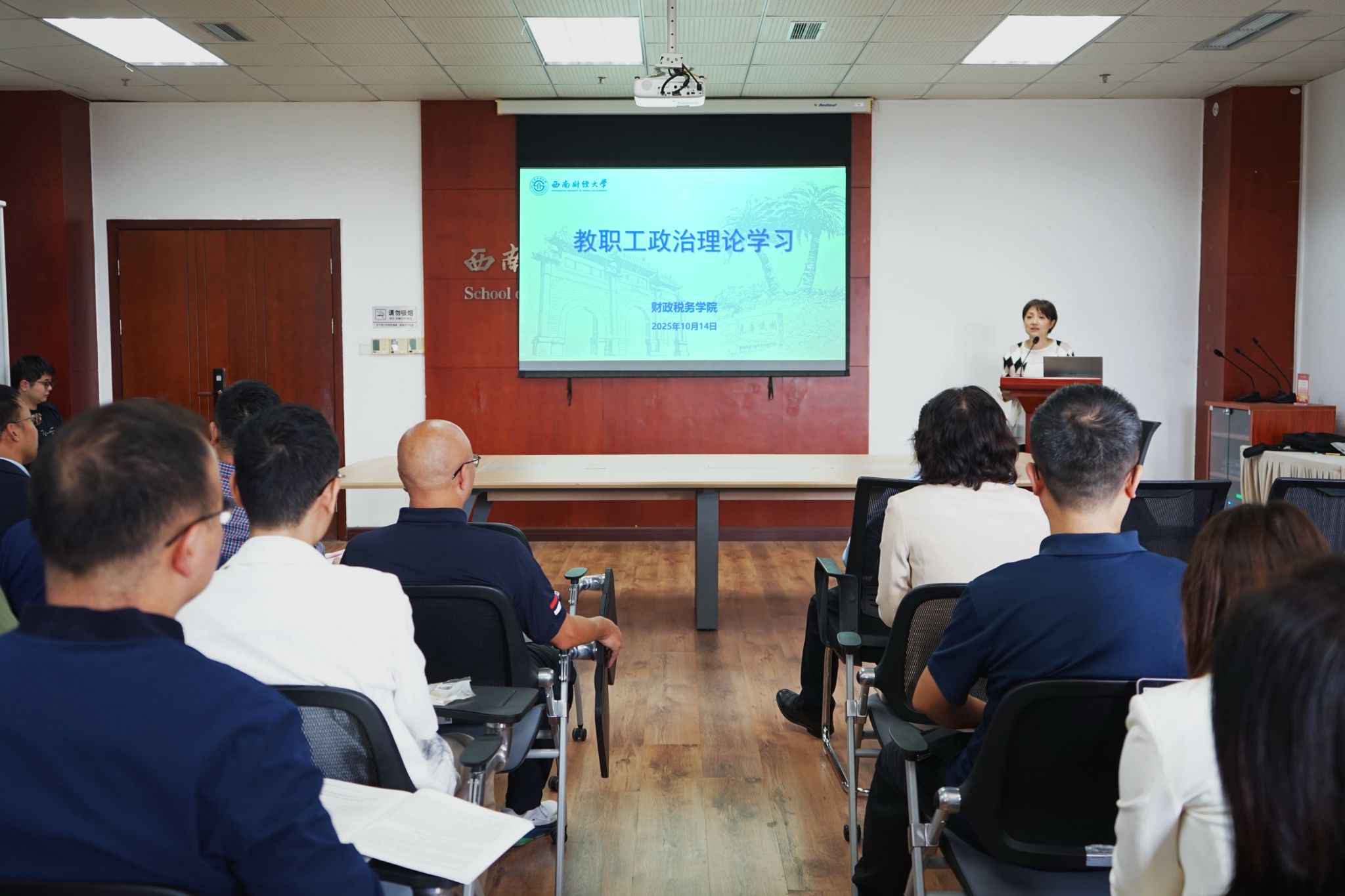 10 月 14 日下午,财税学院于格致楼 811 会议室召开教职工政治理论学习会,学院党委书记吴春力主持会议并领学相关文件,全体教职工参会。