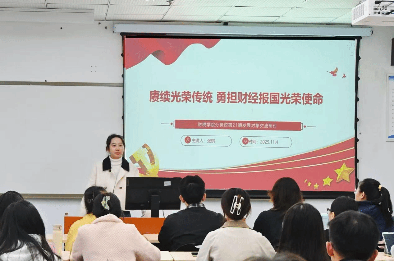 2025年11月4日下午,财税学院第21期发展对象交流研讨会在格致楼J203举行,本次研讨会由学院专职组织员张琪主持,主题为“赓续光荣传统,勇担财经报国光荣使命”,培训班全体学员参加。