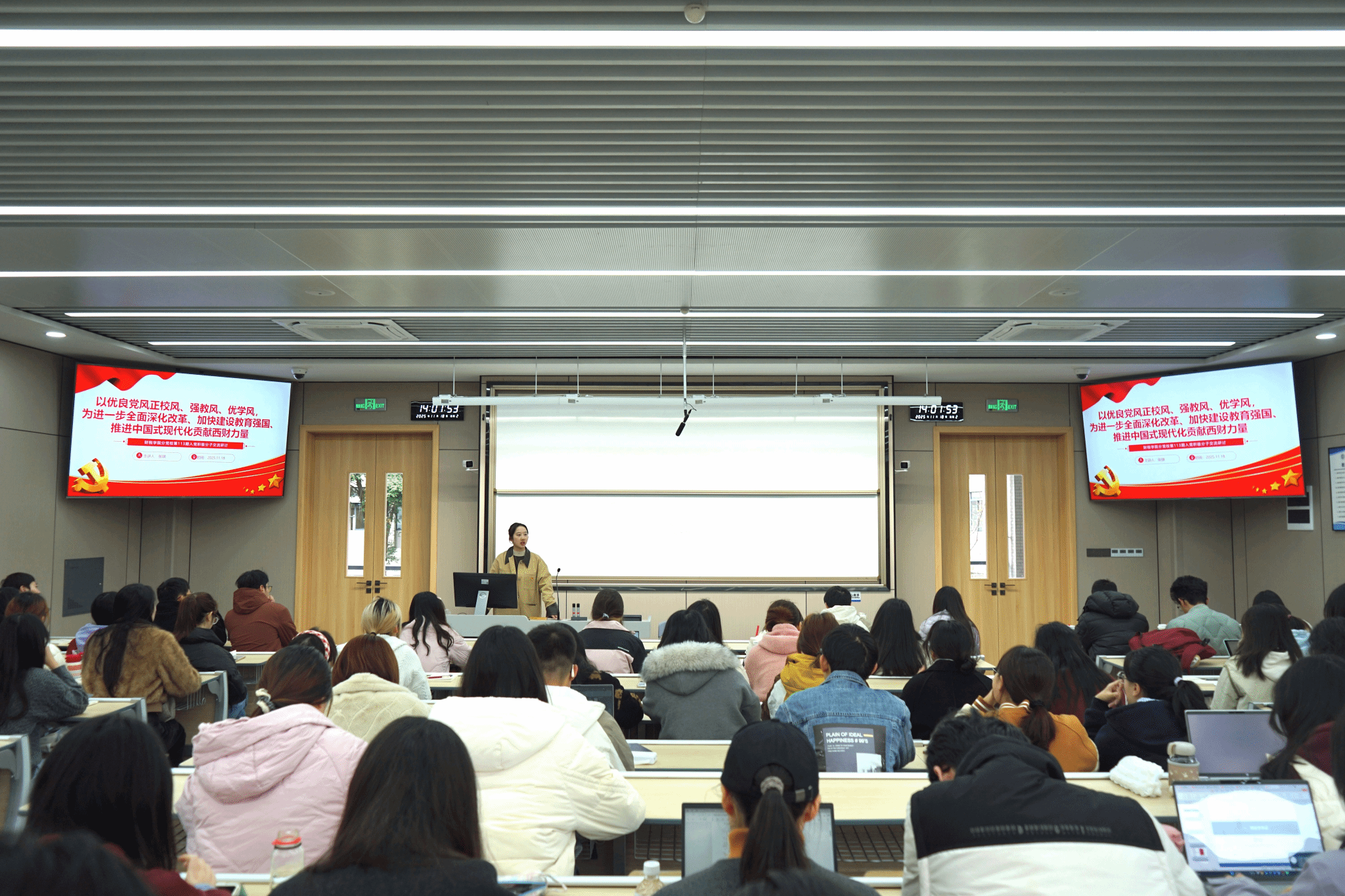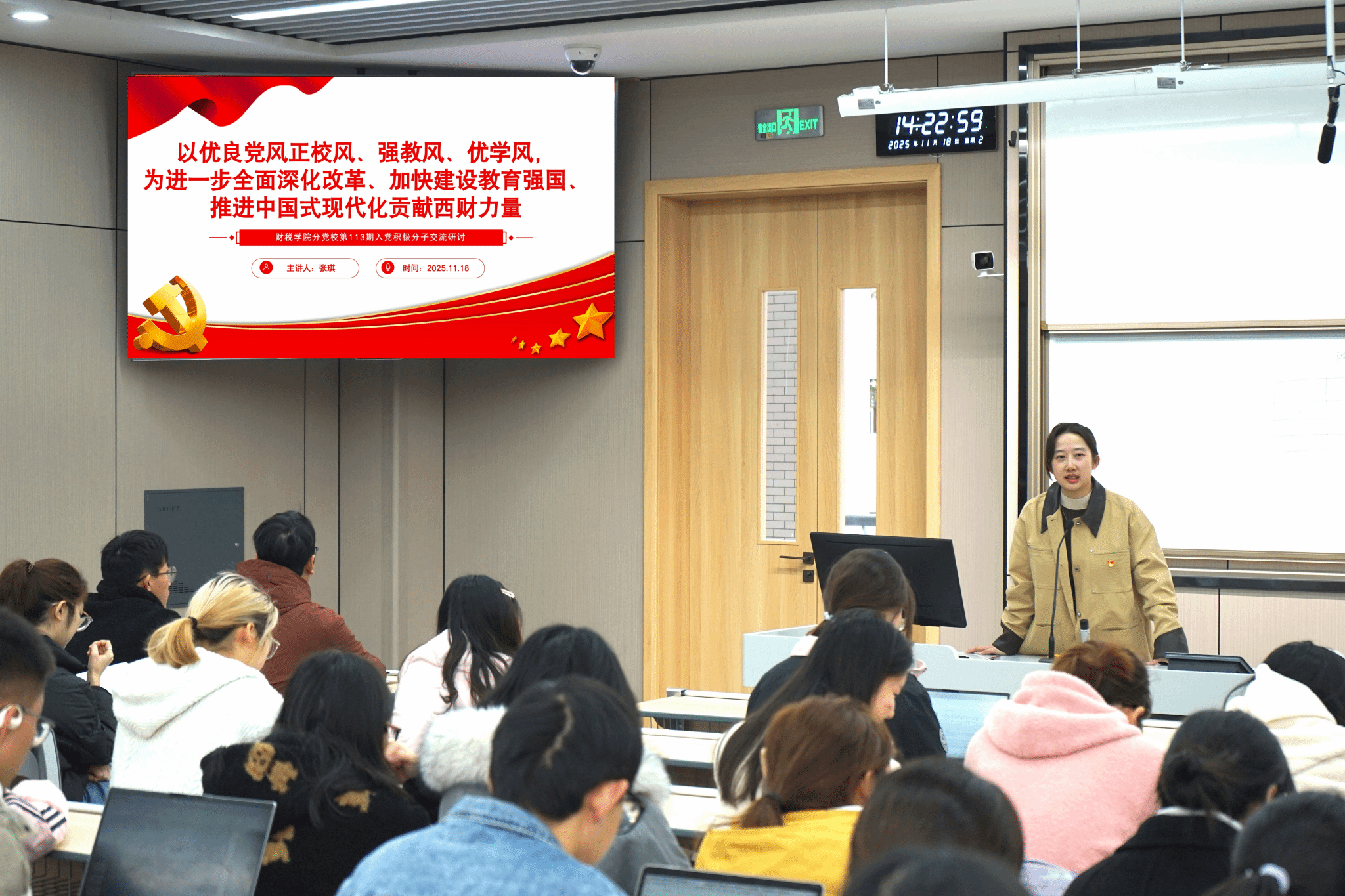 2025年11月18日下午,财税学院第113期入党积极分子交流研讨会在经世楼E203举行。本次研讨会由学院专职组织员张琪主讲,以“优良党风正校风、强教风、优学风,为进一步全面深化改革、加快建设教育强国、推进中国式现代化贡献西财力量”为主题,入党积极分子培训班全体成员参加。
