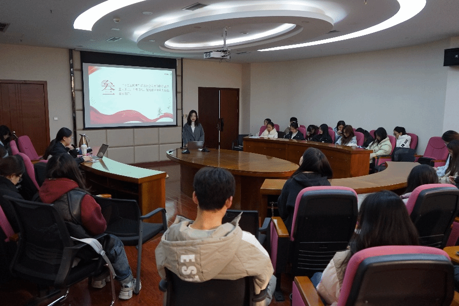 为深入学习贯彻党的二十届四中全会精神,提升学生干部理论素养,12月16日下午,财政税务学院学生骨干培训班在格致楼918会议室开展本学期的理论培训。本次培训邀请学校“经世澎湃”宣讲团“光矢青年”分团成员龙嘉雯、唐亭担任主讲人,学院学生骨干参与。