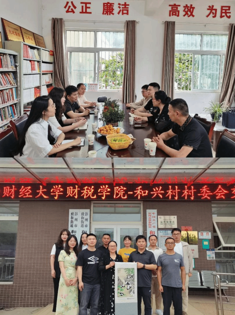 调研组来到彭州市致和街道和兴村党群服务中心,与和兴村村委会工作人员开展交流座谈。村委会汤书记首先对和兴村基本情况进行简要介绍,着重讲述了当前部分重点工作的开展状况,以及驻村选调生的工作情况。财税学院校友、驻和兴村选调生伍西贝与驻濛阳街道泉沟村选调生谢春雨两位同志讲述了个人的驻村工作情况,分享了对于选调生工作的认识和驻村工作经验。调研组的师生也就和兴村村务工作、选调生职业发展和学生能力培养等相关问题进行了交流。