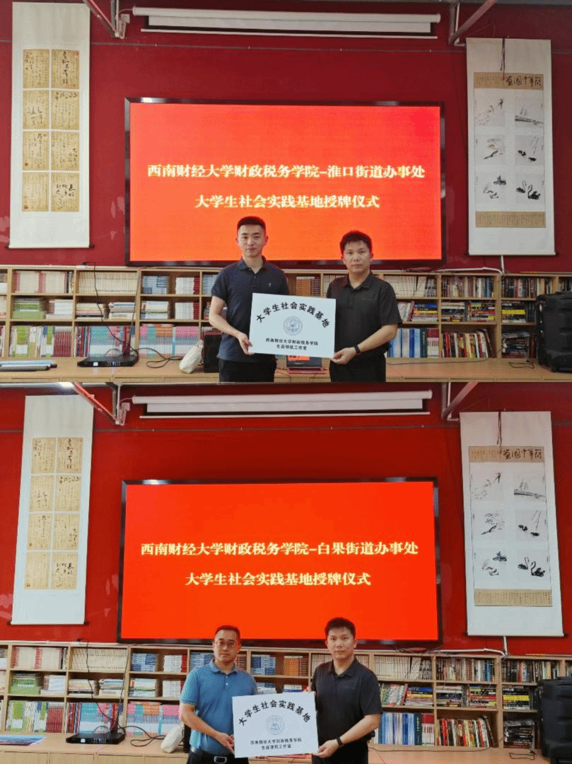 随后,举行了西南财经大学财税学院-白果街道、西南财经大学财税学院-淮口街道“大学生社会实践基地”的授牌仪式。