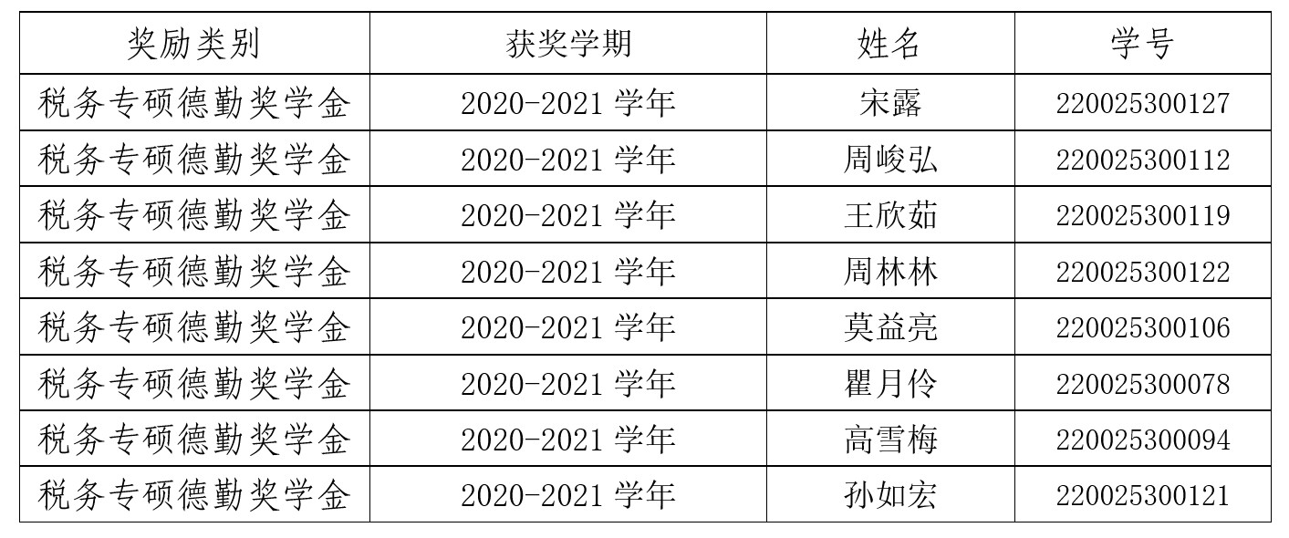 根据《西南财经大学财政税务学院“税务专硕德勤奖学金”评审及管理办法》,财政税务学院学生工作小组负责组织评审工作,现将评审结果予以公示,公示期2021年11月1日至11月3日,如有异议,请在公示期内以实名邮件反映至邮箱:huangp@swufe.edu.cn.