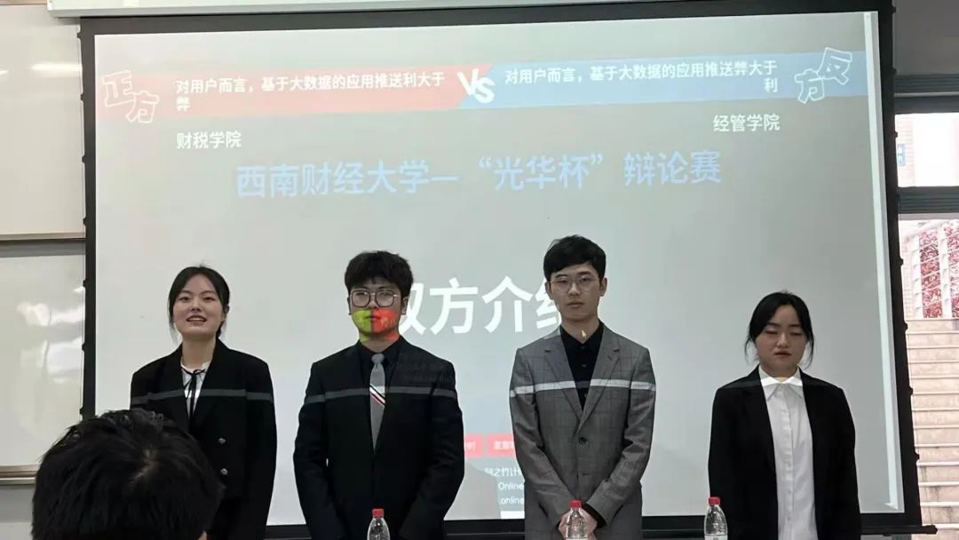The grand final of the "Guanghua Cup," the Southwestern University of Finance and Economics' top debating competition, was held in the 400-person hall of the Hongyuan Building on May 28th.The debate title was "Accepting the absurdity of life is a sign of strength/cowardice," and our team faced the School of Finance's debate team in the final. The four debaters addressed the core of absurdity, elaborated on it with their distinct ideas and compelling arguments, and won the judges over with their unspoken collaboration and pinpoint assaults. The competition's process was not without its bumps. Nonetheless, the debaters' incisive questioning and subdued reaction on the field propelled the taxation debating team back to the top of the light, winning the debate.